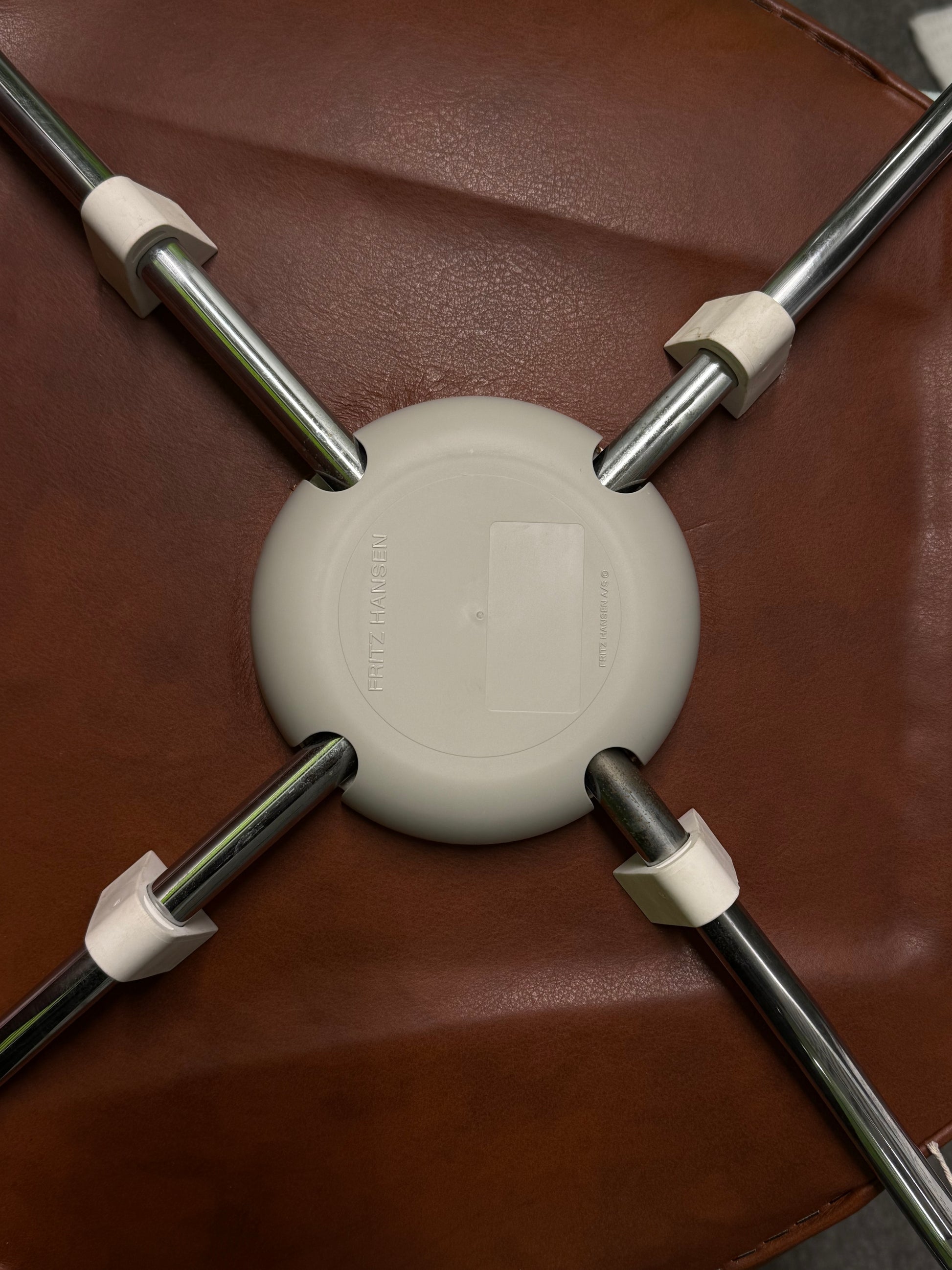 Nyklädd i Soft Brandy-läder och försedd med nytt skum. Stolarna verkar ha hård rygg och inga defekter. Stolarna är original och tillverkade av Fritz Hansen. Klädseln är tillverkad med exakt samma metoder som hos Fritz Hansen.